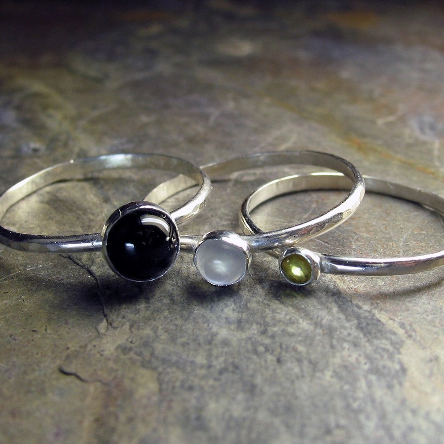 Black star diopside, white moonstone and citrine adorn this dainty set of 3 sterling silver stacking rings. The white moonstone shimmers against a black night sky, with the promise of the golden sun in the morning.